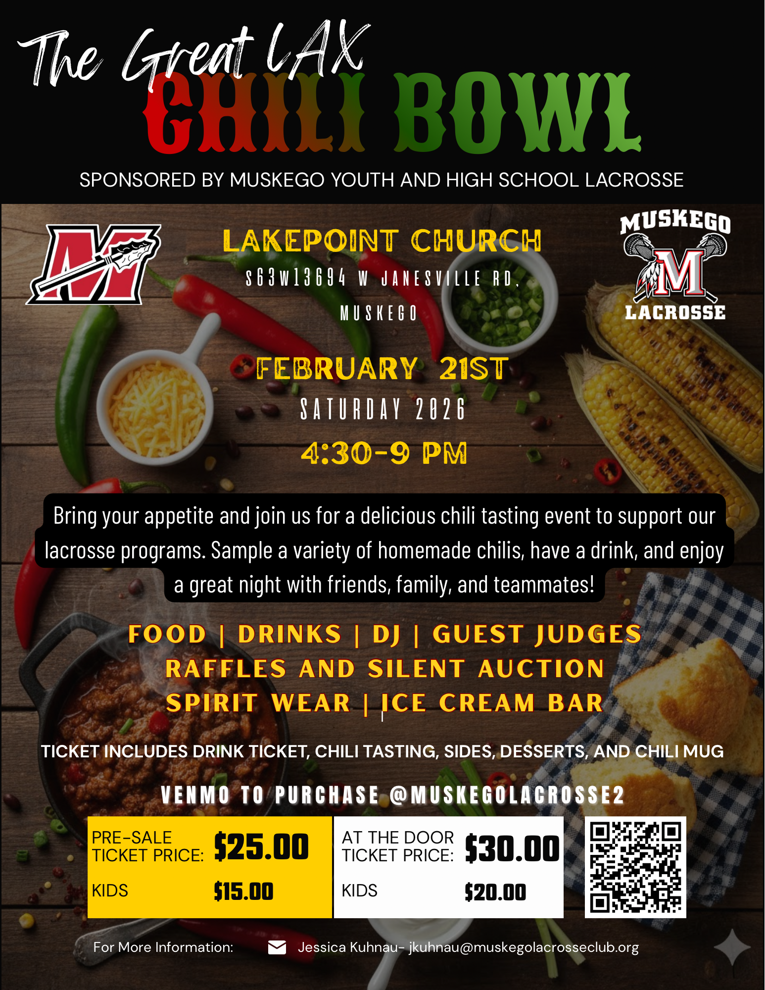 All lacrosse families are invited to this inaugural event being held on Saturday, February 21st from 4:30-9pm. Bring your appetite and join us for a delicious chili tasting event to support our youth and high school lacrosse programs. Chili sampling, drinks, raffles, music and entertainment will be on hand. Event is open to the public so bring some friends or neighbors as well for a fun night out! Pre-Sale Tickets are $25 for adults, $15 for Kids. ($30/$20 at the door). Ticket includes a drink ticket, food, and a custom chili mug to keep! Tickets can be purchased through Venmo @muskegolacrosse2 or in person at open gym and practices.