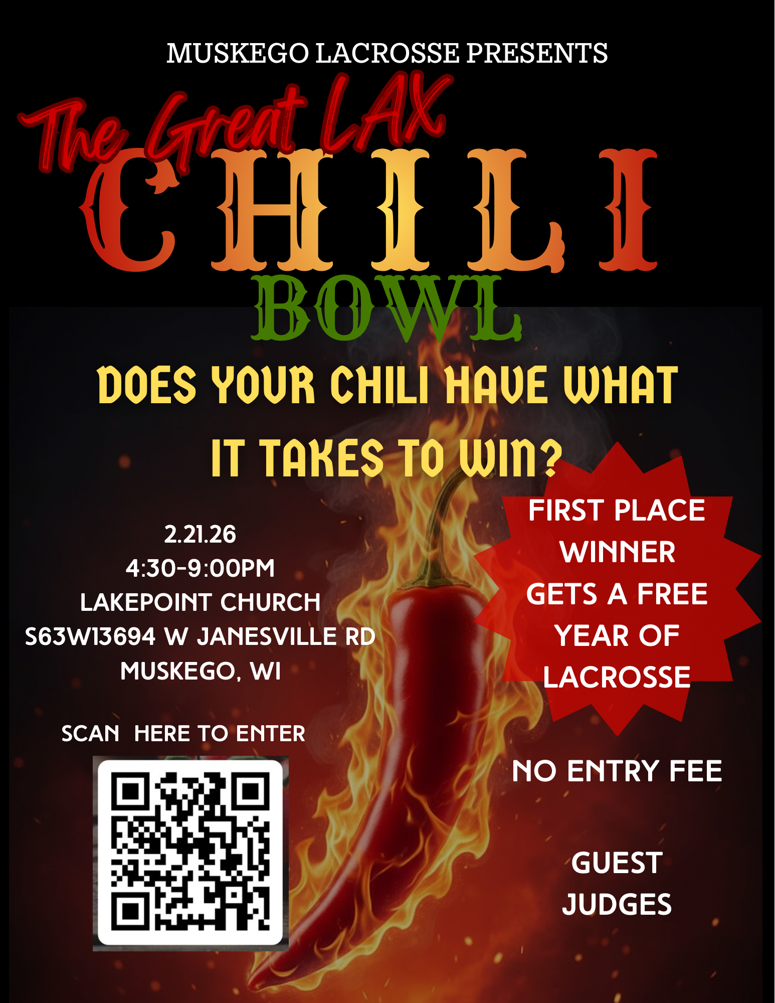 For those who feel they got what it takes to crown themselves as the Chili King of Muskego, we encourage you to enter the contest with your recipe and be judged by our "Celebrity" Guest Judges. Participants will get FREE admission and first place winner gets their lacrosse season for FREE! To enter the contest please fill out the form by clicking the button below. You may also scan the QR code in the flyer below.